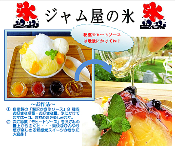 そんな、10周年を記念して新商品も誕生!これまでの市販の着色料と香料のかき氷シロップでは物足らず、ジャム屋の夏のカフェメニュー「贅沢かき氷」のために製造し始めたかき氷専用ジャムソース。お客さまからの「持ち帰りたい」との声にこたえて、昨年からテスト販売をしてきましたが、この7月15日に正式に「果肉たっぷり贅沢かき氷ソース」シリーズの販売を開始しました!下の写真はジャム屋の夏のカフェでの贅沢かき氷のメニュー。そしてその下の写真が新発売を始めたジャムズブティックでのかき氷専用ジャムの陳列です。
